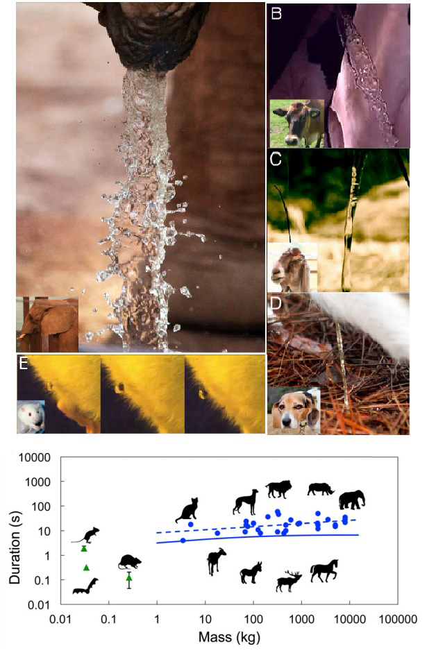 不同体型哺乳动物排尿时间相近,体型越大流速越高。上图中A是大象,B是牛,C是羊,D是狗,E则是大鼠。下图是各种哺乳动物的体重与小便时长间的关系。图片来源:Patricia J. Yanget al. (2014) PNAS.研究小组首先去亚特兰大动物园观察了不同大小的哺乳动物们尿尿——它们的体重从0.03千克到8000千克不等,横跨了6个数量级。动物们膀胱的容积则差别更大:长鼻星人(大象,约18升)比喵星人(约5mL)大上了3600倍。研究者在观察的同时小心地拍下了视频,并进行了统计分析。结果显示,32种重于5千克的动物,它们的排尿时间均在21(±13)秒之间,与质量的0.13次方相关。当动物体重小于5千克,例如仓鼠、某些豚鼠,或者某些蝙蝠,尿液只能成滴的往外排,根本不能“嘘嘘”,排尿时间也更不规律。