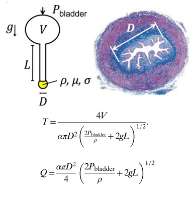 随后,他们将排尿过程抽象成了物理模型,开始欢乐地进行理论推导和模拟。借助流体力学,他们不仅推算出膀胱排空时间应该与体重的1/6(约0.16)次方相关(与观测到的0.13相吻合),还得出“流式”和“滴式”排尿的动物们流速大小与尿道直径、膀胱容积,以及尿道长度之间的量化关系,这个中关系也与观察到的流速变化相符。更进一步地,他们推算出小动物们在“滴式”排尿时,尿滴的直径与尿道直径的1/3次方相关,再一次与实验室中的实际测量值吻合。除此之外,他们还探讨了雌性和雄性(雌性尿道更宽)排尿速度的差别,并也进行了实验验证,以佐证先前导出的公式。