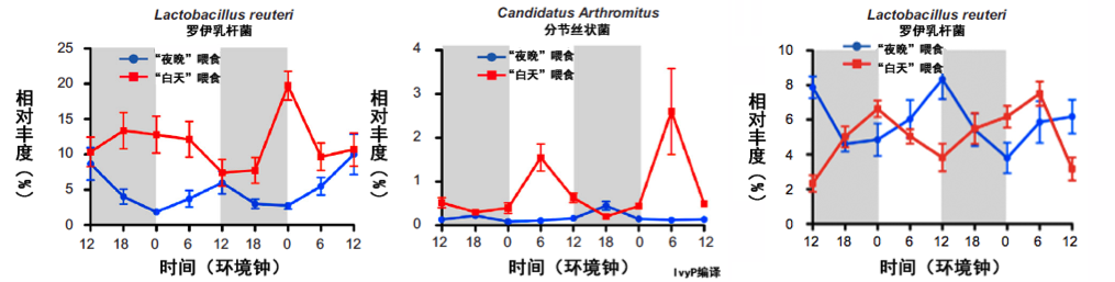 这样喂食2周后,研究者每6小时采集一次小鼠粪便菌群样本,连续采集2天。他们发现,只能在“夜晚”进食的小鼠,肠道菌群的变化与随意进食的正常小鼠的菌群相似,反映出夜行性啮齿类的进食习惯。相比之下,只能在“白天”进食的小鼠,肠道菌群的周期性变化发生了明显的相移,峰值期和低值期几乎都移动了12个小时,并使得某些细菌(如Candidatus Arthromitus )表现出更强的昼夜周期性变化。研究者在Per1/2-/-小鼠进行了相同的实验,发现尽管小鼠的昼夜节律被破坏,但规律的摄食能让小鼠肠道菌群的昼夜周期性变化重新建立起来。这些结果提示,肠道菌群的变化会直接受到摄食时间的影响。