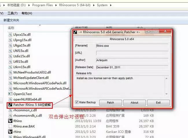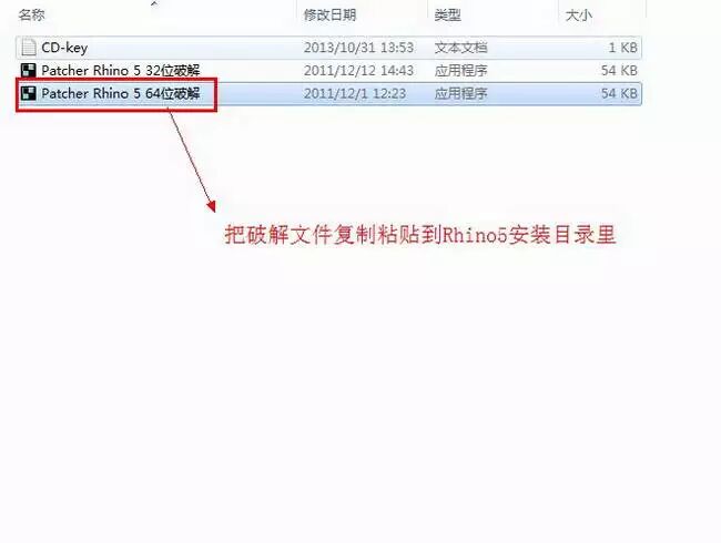 返回到犀牛Rhino5.0安装包,找到“patcher Rhino5.0 64位破解”,把这个破解文件复制粘贴到Rhino5.0的安装目录里。 如图九。