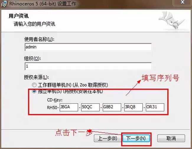 使用者名称和组织这两栏我们可以任意填写,在授权来源一栏,我们选中“独立单机” 并输入RHINO5.0的CD-KEY(序列号):JBGA-50QC-G8B2-3RQ8-OR31。点击下一步。 如图五。