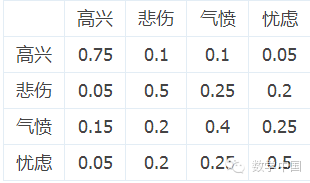 Table 1: HanMeiMei的情绪状态变化表 在这个表格中,每个数字代表了HanMeiMei情绪从某列转变到某行的概率。 比方说,如果HanMeiMei某天的情绪是高兴,那么她将有0.1的概率下一天她会变得 悲伤或者是 气 愤, 有0.05的可能性转变为 忧虑。 每一行代表了从某种情绪转变到各种情绪的概率,因此每行的概率之和为 1。 同理,每一列代表了由各种情绪转变为该列所代表的情绪的概率,因此每列的概率总和也应该为1。