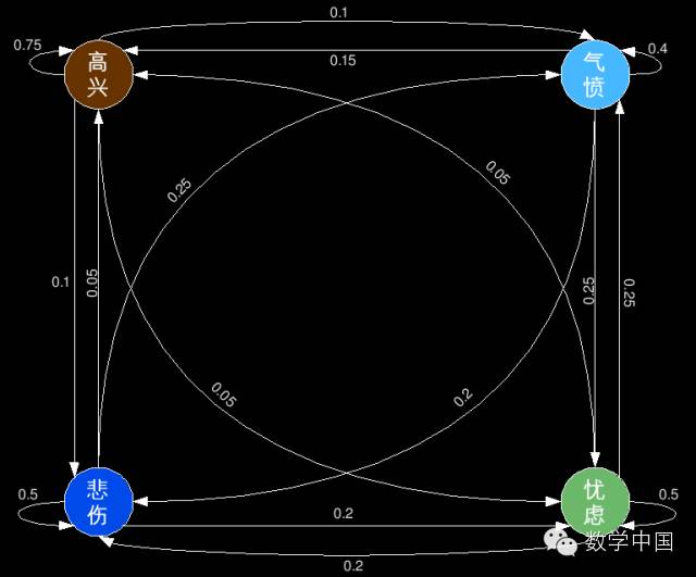 我们可以画一个状态图(图1)来表示表格1, 每个圆圈代表着一种心情状态, 每两种心情变化由一个有向弧,从当前的心情状态指向下一个心情状态表示,每个弧上均带有一个状态转换的概率。