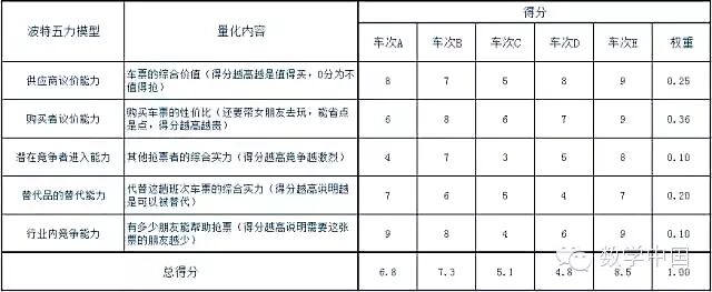 小编整理出目标车票的数据图,运用“波特五力分析模型”对五趟车次进行了量化分析,得分越低说明该车票越容易抢到。