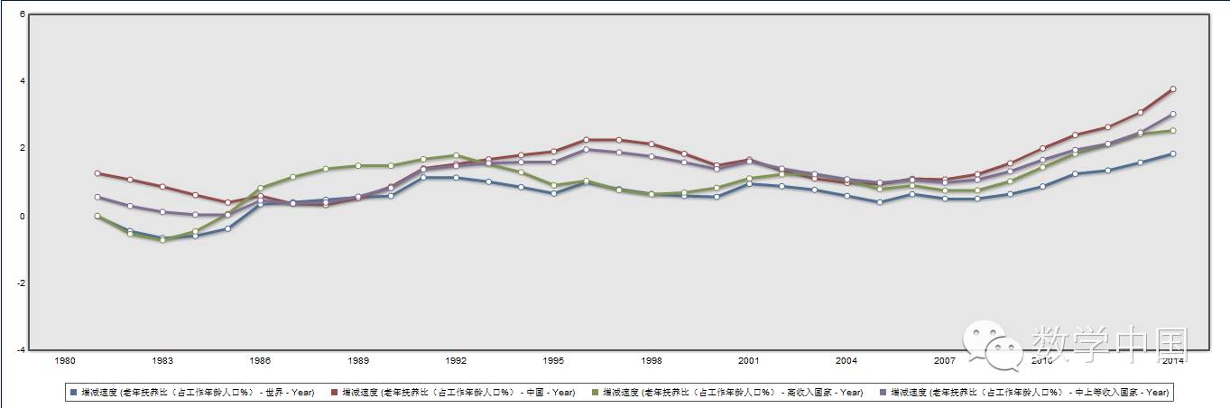 图9: 中国,中上等收入国家,高收入国家以及世界平均抚养比增长速度