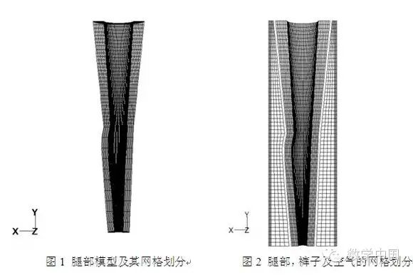 利用Gambit建立三维模型,由于腿部的对称性,只需建立一半。假设这条腿1m长,膝盖在中点,小腿底部半径5cm,小腿肚8cm,膝盖7cm,大腿顶部12cm,结果如图1所示。由于皮肤表面并非37℃常温,因此,在皮肤表面下3mm出建立一个恒温面,设定为37℃。图2中表示传了秋裤和长裤的腿,秋裤和长裤的厚度都为1mm。裤脚出设定为速度进口velocity-inlet,大腿顶部和裤管间为outflow。对称面为symmetry,长裤内空气为fluid,其余体为solid。