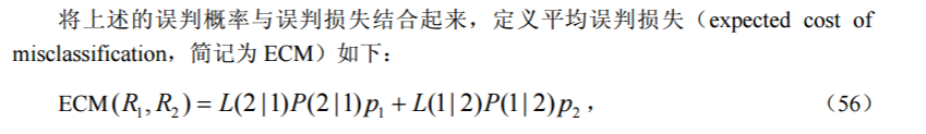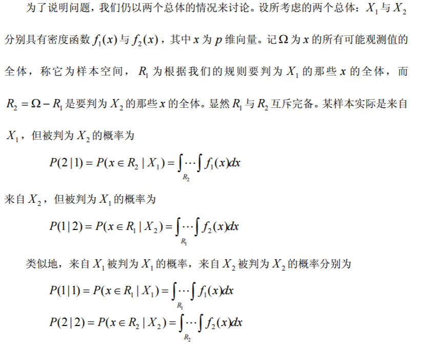 设有两个总体 X1和 X2 ,根据某一个判别规则,将实际上为 X1的个体判为 X2 或者将实际上为 X2 的个体判为 X1 的概率就是误判概率,一个好的判别规则应该使误判概率最小。除此之外还有一个误判损失问题或者说误判产生的花费(cost)问题,如把 X1的个体误判到 X2 的损失比 X2 的个体误判到 X1 严重得多,则人们在作前一种判断时就要特别谨慎。譬如在药品检验中把有毒的样品判为无毒后果比无毒样品判为有毒严重得多,因此一个好的判别规则还必须使误判损失最小。