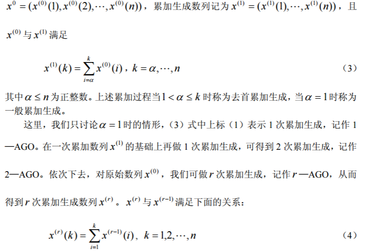 定义 5 把数列 x 各时刻数据依次累加的过程叫做累加过程,记作 AGO,累加所得的新数列,叫做累加生成数列。具体地,设原始数列为