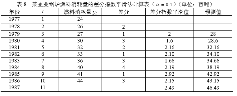解 由资料可以看出,燃料消耗量,除个别年份外,逐期增长量大体在 200 吨左右,即呈直线增长,因此可用一阶差分指数平滑模型来预测。我们取 α = 0.4,初始值为新序列首项值,计算结果列于表 8 中。预测 1987 年燃料消耗量为