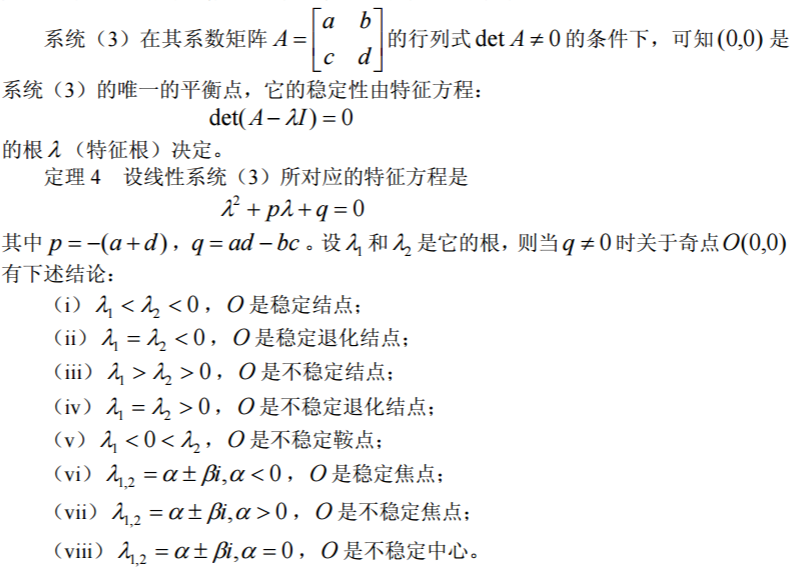 (i)如果系统(3)的系数矩阵 A 的一切特征根的实部都是负的,则系统(3)的 零解是渐近稳定的。