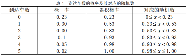解 这是单服务台的排队系统,可验证到达车数不服从泊松分布,服务时间也不服 从指数分布(这是定长服务时间)。 随机模拟法首先要求事件能按历史的概率分布规律出现。模拟时产生的随机数与事 件的对应关系如表 4。