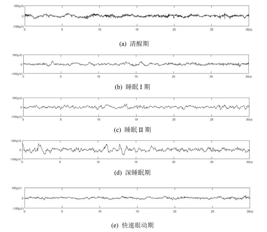' l7 y/ I* i5 Y1 s2 ]4 J[color=rgba(0, 0, 0, 0.5)]睡眠脑电:是自发脑电信号的一种,能够反映身体状态的自身变化,也是用来诊断和治疗相关疾病的重要依据。根据睡眠状态进一步分为清醒期、睡眠I期、睡眠II期、深度睡眠和快速眼动期,脑电信号如图2所示。$ Q; Q6 r" e K/ @) T