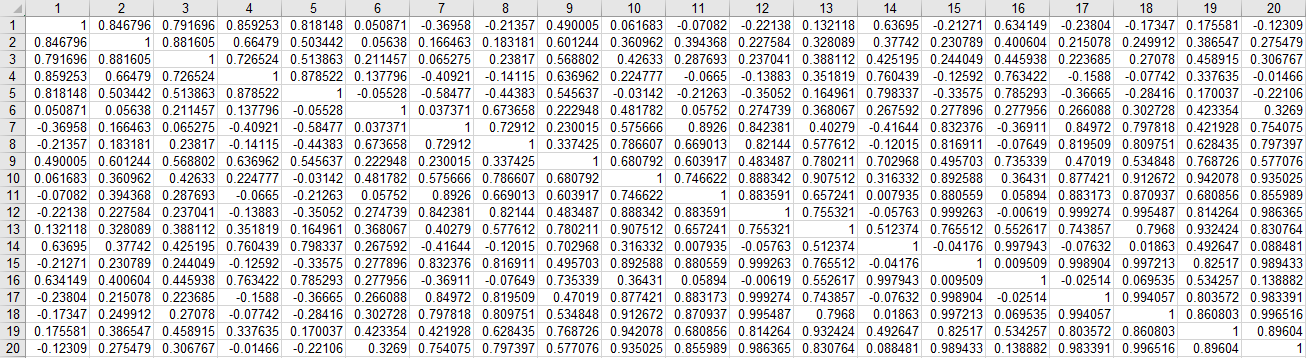 对于每个表格循环读取每行脑电数据,并保存为最终二维数组。接着将每个通道作为一组向量,求取两两向量间的皮尔逊相关系数,生成大小为[20,20]的相关系数矩阵,可将其存为表格以便观察,如图5所示,是第5位受试者训练数据相关系数矩阵。行列索引表示通道标识符,为该通道的数据向量,矩阵具有沿对角线的对称性,所以只观察下三角区即可。图示中的数据说明,不同通道向量之间的相关性不同,有正相关有负相关,有相关性较强的,也有无关的。相关系数越高,说明这两个通道的脑波的变化特征越相似,相关性极强的可只用一个通道表征这种特征,另一个通道是冗余的。3 ^; J3 w/ U; H+ {