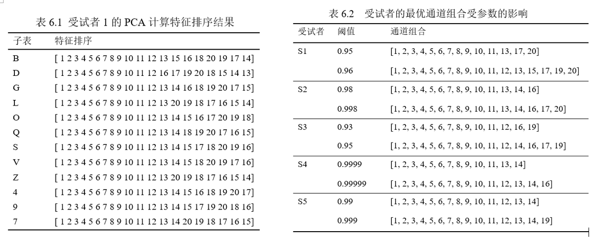 0 O8 ]; ^* A* j对于每位受试者,遍历训练数据中所有目标字符的子表,对其对应数组计算相关系数矩阵和PCA的特征排序数组。对于相关系数矩阵,每位受试者设置不同的阈值,系数大于此值的,将其行列索引即通道标识符进行保存。对于每个子表,对筛选出的相关通道对,比较其在特征排序数组中的前后位置,若比较靠后的通道其索引>10,则说明此通道包含的信息较少,且其信息少于另一通道,则将此通道删除,另一通道保留,依次循环所有通道对。/ j( p1 m2 O. o9 ]