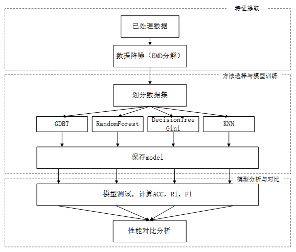 / M. G' ?# G1 J; J/ n以经过去冗余处理后选取得13个通道数据作为分类输入,通过多种模型得性能对比,选取其中最优的模型,实验流程如下图所示。
