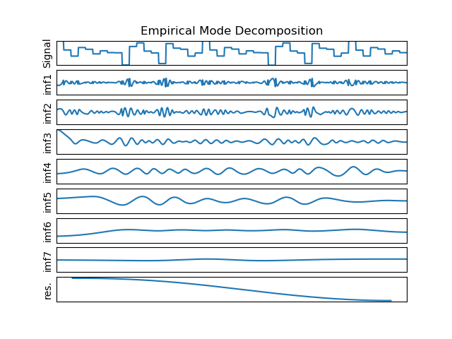 - ?) O7 \4 d4 S在解决问题1时,我们对附件1中的信号序列进行EMD分解,结果如下图所示,其中imf1~7为从原始序列中分离出来的频率依次从高至低的局部特征信号,res为经过7次imf分量分离后的剩余信号分量。为减少高低频噪声对后续模型训练的影响,我们将原始信号分别剔除高低频分量作为后续的训练数据。
