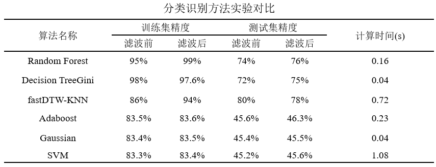通过实验可以发现,具有较好精度性能的模型为Random Forest、Decision TreeGini、fastDTW-KNN。其中Decision TreeGini计算时间最短,但测试集精度最低;SVM算法训练集精度良好,但测试集精度较低且耗时较长;fastDTW-KNN性能相对稳定。* W) }* q/ M9 S5 `; u