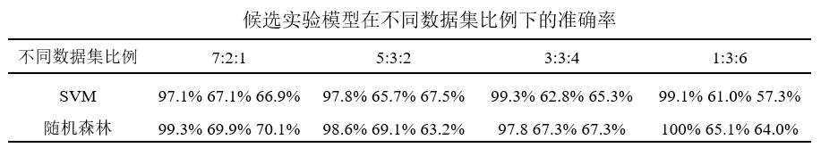 . V' i" j0 |3 K) o# I/ q候选实验模型在不同数据集比例下的准确率如下所示。) q1 n X a% N4 ?% P9 T3 s9 ~