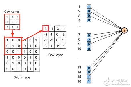 0 f5 X8 h: s0 m前面我们介绍的神经网络称为全连接神经网络,因为前一层每个神经元的输出都作为下一层每个神经元的输入。卷积神经网络恰恰相反,不需要全连接,只有部分前一层输出做为后一层的输入。可以简单理解为有一张6X6像素的图片,还有一个3X3的窗口,然后进行从左到右,从上到下一格一格的移动,每次计算窗口里的值和对应图片值的乘积和作为新的像素点,放在一个新的图片里。
