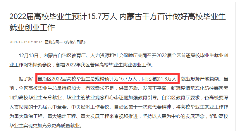 而且2022年内蒙古高校毕业生预计15.7万人
