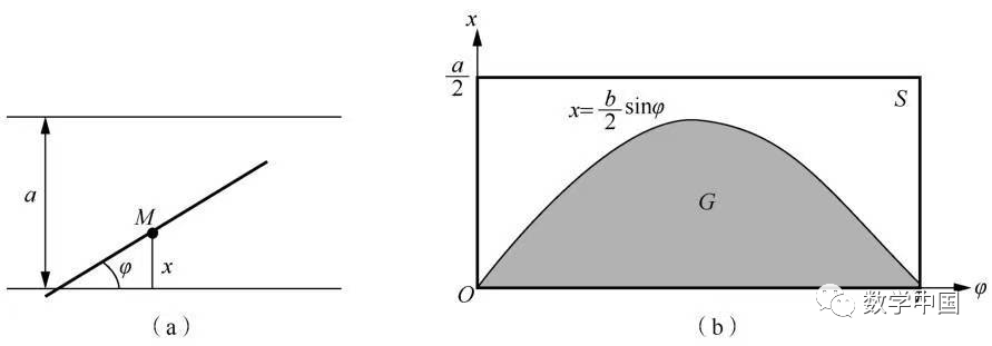 思路分析 针是随机投到纸上的,其与线的夹角φ在0~π之间是等可能取到的.另外,针的中点到最近一条线的垂直距离x是在0~a/2上等可能取到的,从而可知,任一针的位置可用针与线的夹角φ和针的中心到最近一条线的垂直距离x来代表,记为(φ,x),显然(φ,x)在区域S上是均匀分布的.