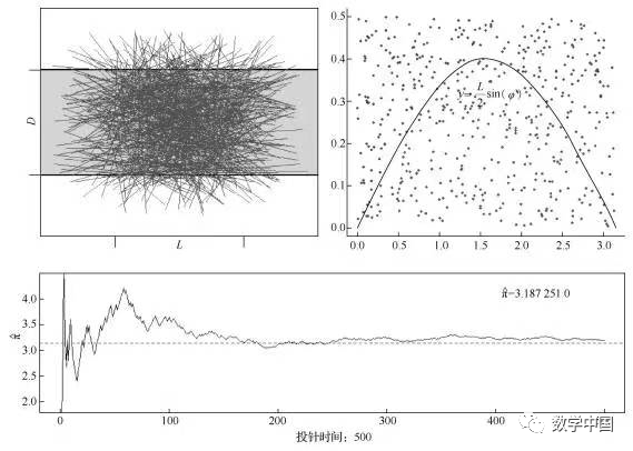 其中N为总投针次数,n为针与平行线相交次数.以针线相交的频数估计针线相交的概率,从而得到要估计的量π.