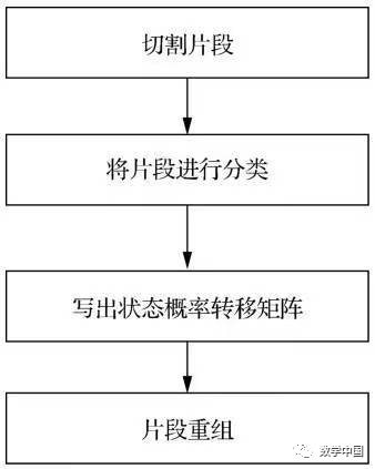 模型建立 以上述思想为理念,可以构建具体的模型.首先将重型汽车长时间的行驶划分为各个片段,再用聚类分析的方法将各片段分为多个大类,片段会随时间变化在各个大类中转移,可以将这个过程看成马尔科夫链.设定片段拼接优化指标D,根据马尔科夫链的性质和指标D确定片段重组标准,最后检验重组的片段是否能代表实际行驶状况.模型步骤框图如图2.7所示.