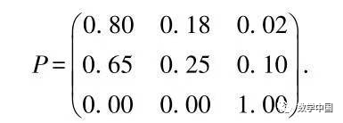 模型建立 由于这里的状态3是吸收状态,也就是说,到这个状态后,将不再会改变为其他状态,所以模型和前面有一定的不同.其转移矩阵为