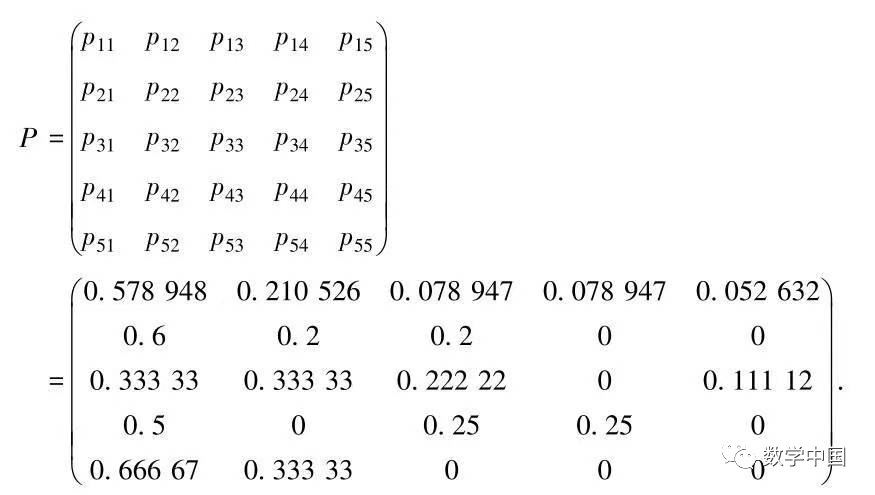 由于无法知道概率,所以用频数代替概率来写出转移概率矩阵,因为数据量很大,这样的假定通常是合理的.设大类i到大类j的转移概率为