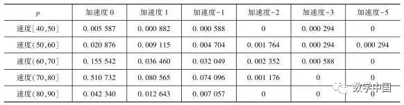 首先根据速度和加速度可以写出联合概率分布.试验数据出现的加速度有1,0,-1,-2,-3,-4,-5;试验数据出现的速度在40~90之间,所以可以将速度分成[40,50),[50,60),[60,70),[70,80),[80,90)5个区间.用相应区间内的频数除以总频数即得到相应的频率分布,近似作为速度的概率分布,经过计算得到的速度-加速度联合概率分布如表2.6所示.