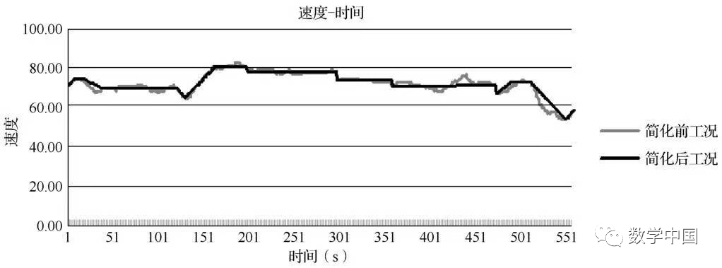 为了做对比,将原实际工况约两周的时间段压缩为一小时左右,和简化后工况同长.可以看出,简化后的工况相比简化前的工况更加平滑,也非常接近于简化前的工况.用简化后的工况代表汽车在公路上的行驶状态,从而为研究如何降低重型汽车耗油量提供帮助.