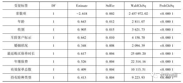 采用逻辑回归将客户的各个变量与是否加保进行分析,得到强影响的变量有年龄、性别、是否具有车险、客户是否结过婚、最近一次购买保单距今时长、有效险种对应的年缴保费、有效保单总数和持有险种类型这8个变量.逻辑回归模型参数表如表2.11所示.