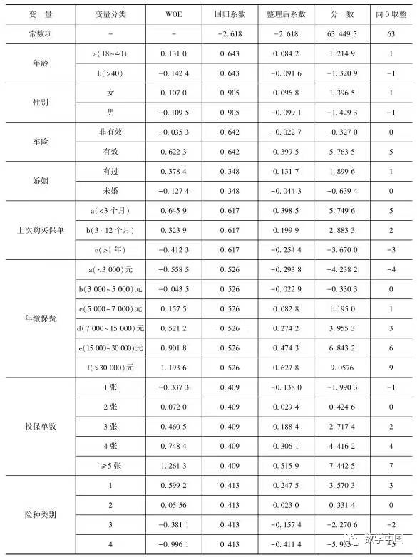 思路分析 在保险业务的客人加保分析中,常常通过证据权重(Weight of Evidence,WOE)法,将逻辑回归模型所得的结果转换为标准评分卡的形式,方便保险公司对于加保可能性大小不同的客户进行分类和区别处理.