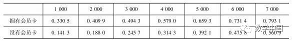 对于这一类顾客群体,他们使用优惠券的概率约为0.33.上述结果显示:年消费支出为1 000元的顾客,拥有会员卡会比没有会员卡的顾客使用优惠券的概率多1倍以上.