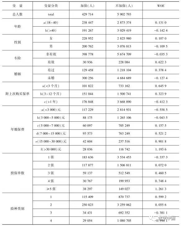 按照建模中计算各个变量分类对应的WOE值(WOE=ln((bad/bad总数)/(good/good总数))=ln((加保/加保总人数)/(不加保/不加保总人数)),计算结果如表2.12所示.