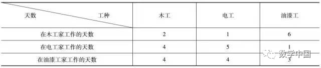 工资问题:现有一个木工、一个电工和一个油漆工,三人相互同意彼此装修他们自己的房子。在装修之前,他们达成了如下协议:(1)每人总共工作10天(包括给自己家干活在内);(2)每人的日工资根据一般的市价在60~80元之间;(3)每人的日工资数应使得每人的总收入与总支出相等。表5-5-1是协商后制定出的工作天数的分配方案,如何计算出每人应得的工资?
