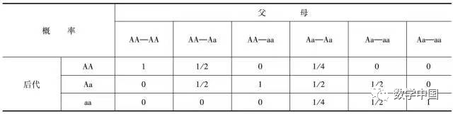 遗传中,后代是从父母的基因对中各继承一个基因,形成自己的基因型。如果我们所考虑的遗传特征是由两个基因A和a控制,那么就有三种基因型,表5-5-3给出父母基因型的所有可能组合使其后代形成每种基因对的概率。