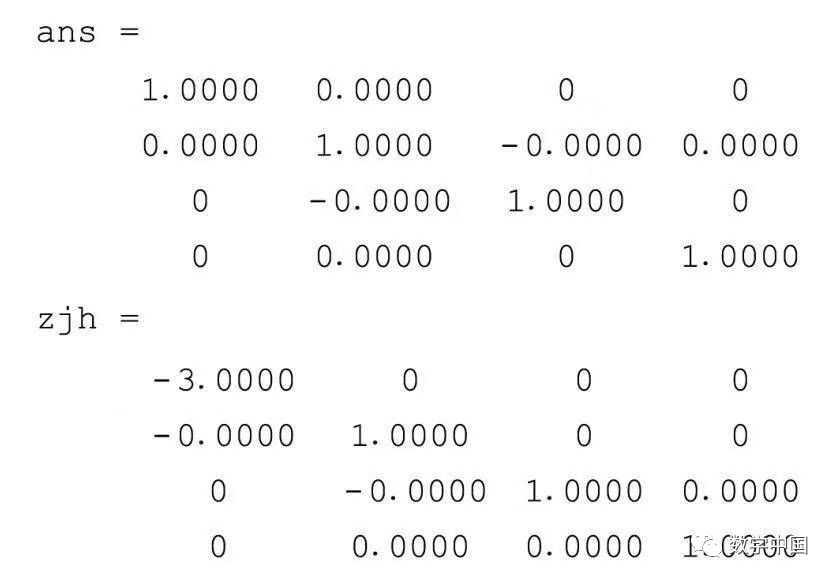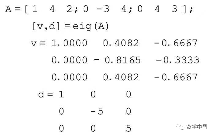 结果返回特征向量矩阵v和特征值矩阵d,其中d为对角阵。