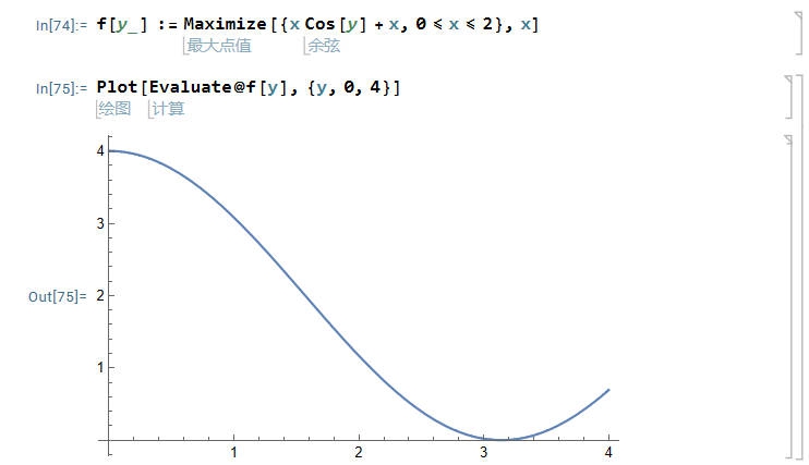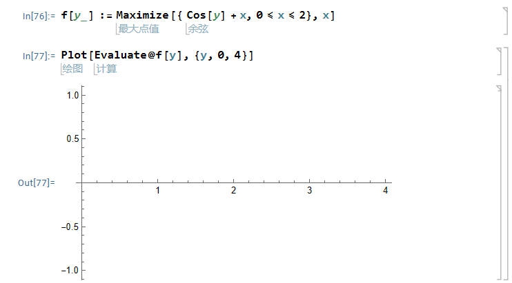 求助:7 A8 G; M# c& l1 g2 ^2 Y f[y_]:=Maximize[{x+x Cos[y],0<=x<=2},x]# z, u( o H, c Plot[Evaluate@f[y],{y,0,4}] 可正常画出曲线图6 D. E9 s, x" _5 R% j, ?3 L/ x' p' a 但运行下面代码就没有反应,求问是什么原因 f[y_]:=Maximize[{x+Cos[y],0<=x<=2},x] Plot[Evaluate@f[y],{y,0,4}] 1 H& w6 w5 b! g* U* l+ N& V 1 r9 F9 g6 Z& S$ U' J$ V" T# i ( u- H# @. G; b; k7 I |