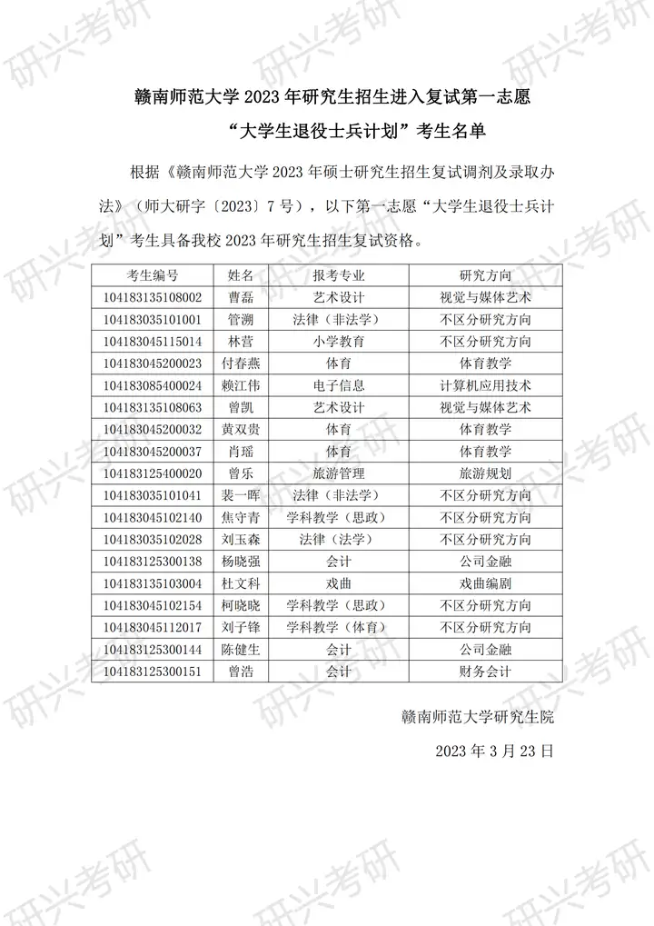 需要完整名单的,留言发送!赣南师范大学 2023 年研究生招生进入复试第一志愿 “大学生退役士兵计划”考生名单