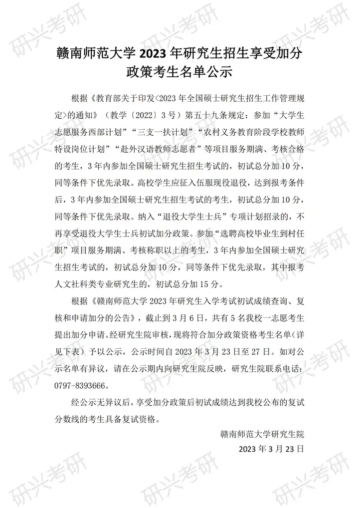 赣南师范大学 2023 年研究生招生享受加分 政策考生名单公示